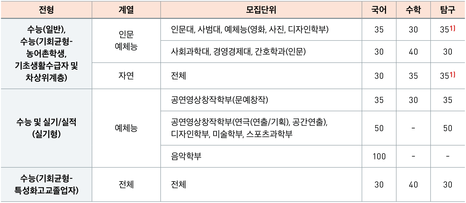 * 수능 영역별 반영비율![]() 1) 인문대/사범대: 사회탐구 변환표준점수 가산점 5% 부여 자연계열 전체: 과학탐구 변환표준점수 가산점 5% 부여 |