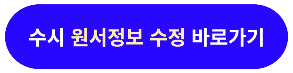수시모집 지원자 중 원서접수와 관련하여 개인정보 변경 신청 절차를 안내해 드립니다. 원서접수 완료 후 개인정보가 변경된 학생의 정보 수정을 반영할 수 있습니다. 이름, 주민등록번호, 전형료 환불계좌, 집 주소, 연락처 등 개인정보 등은 변경이 가능하지만, 원서접수 전형 및 학과의 변경은 불가합니다. 원서정보수정의 운영목적, 운영절차, 변경대상, 유의사항 등은 아래 내용을 참고하시기 바랍니다.