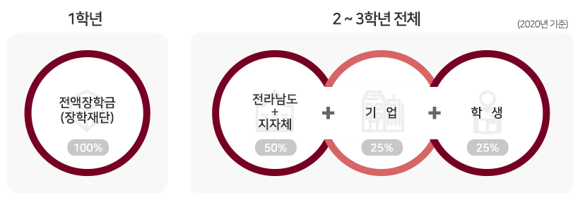 | 등록금(학기당) | 등록금지원 (교육부, 전라남도+ 여수, 순천, 광양시 지자체) |