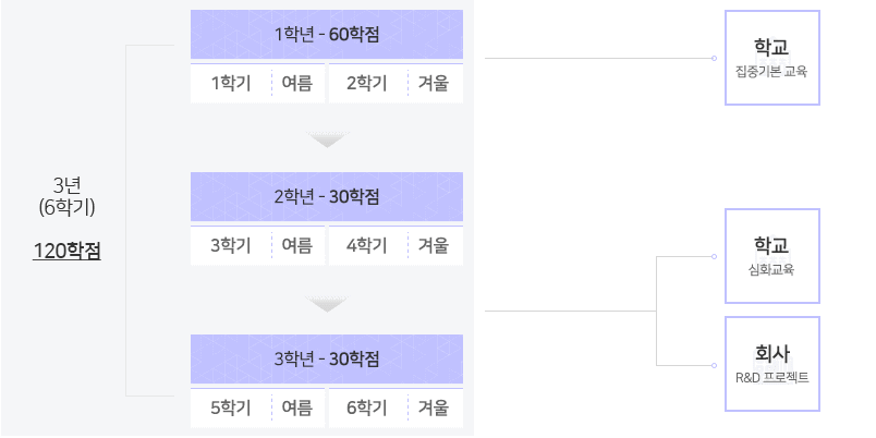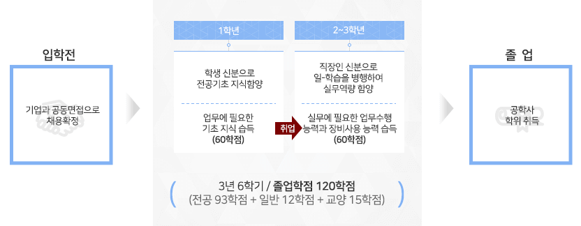 입학 전에는 수시 및 정시 모집을 통해 기업과 공동면접으로 채용을 확정합니다. 1학년은 학생 신분으로 전공기초 지식 함양을 위해 대학에서만 업무에 필요한 기초 지식을 습득하며 60학점을 이수하게 됩니다. 1학년이 끝나면 기업체와 근로계약서를 작성합니다. 2·3학년은 직장인 신분으로 일과 학습을 병행하여 실무역량 함양을 하게 됩니다. 실무에 필요한 업무수행 능력과 장비사용 능력 습득을 배우며 총 60학점을 이수합니다. 3년 6학기 동안 전공 93학점, 일반 12학점, 교양 15학점 등 총 120학점을 수강하면 졸업하고 공학사 학위를 취득하게 됩니다.