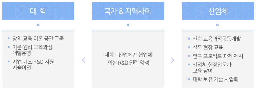 | 연구개발(R&D)지원 | - 기업이 주관기관이 되고 필요에 따라 대학이 위타기관이 되어 기술 및 신제품 개발지원 - 참여 기업의 R&D 프로젝트에 대학의 연구개발 자원 등을 활용해 보조연구원으로 참여 |