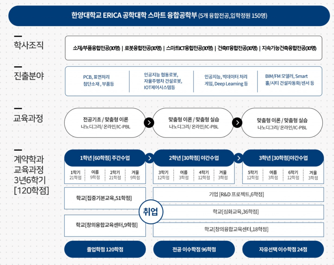 한양대학교 ERICA 공학대학 스마트 융합공학부는 5개 융합전공, 입학정원 150명(2024학년도 입학기준)을 선발했습니다. 학사조직, 진출분야, 교육과정, 졸업학점에 대한 부분을 살펴보도록 하겠습니다.