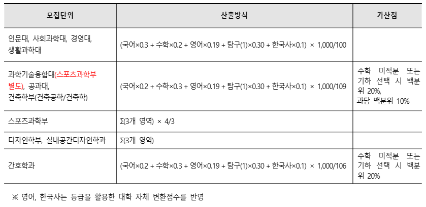 | 모집계열 | 국어/수학 | 영어 | 탐구 | 한국사 |
