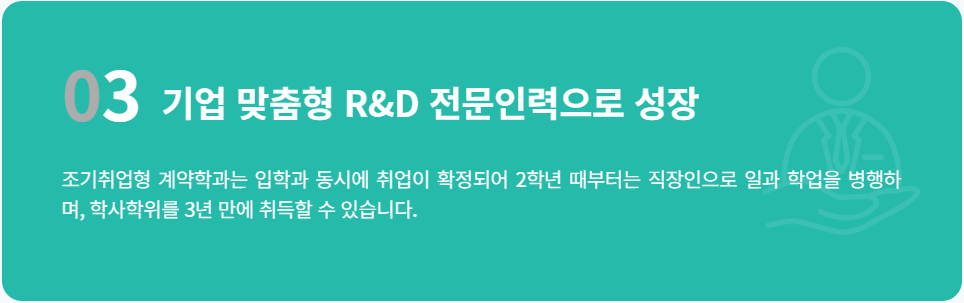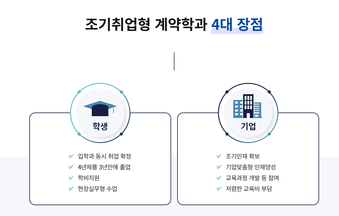 조기취업형 계약학과는 대학과 기업이 계약을 통해 현장실무역량을 갖춘 인력을 양성합니다. 기업은 인력양성을 위한 교육비의 일부를 부담하고 대학은 기업 수요에 맞춘 교육과정을 개발, 운영하여 기업에 맞춤형 인재를 공급합니다. 조기취업형 계약학과는 입학과 동시에 취업이 확정되어 2학년때부터 직장인으로 일과 학업을 병행합니다.