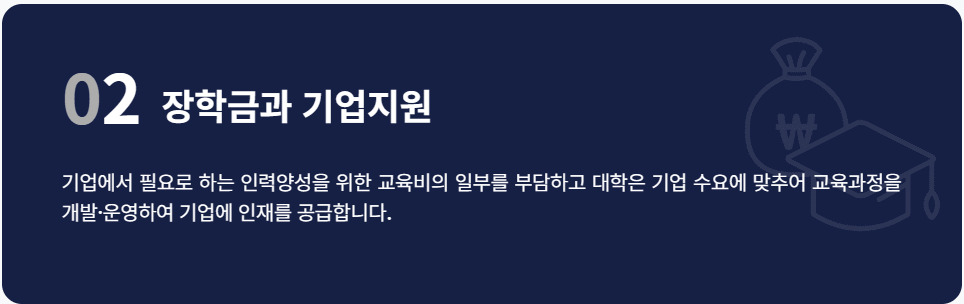 조기취업형 계약학과는 대학과 기업이 계약을 통해 현장실무역량을 갖춘 인력을 양성합니다. 기업은 인력양성을 위한 교육비의 일부를 부담하고 대학은 기업 수요에 맞춘 교육과정을 개발·운