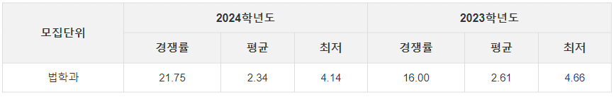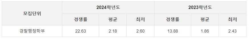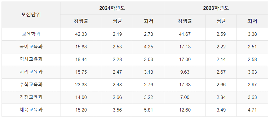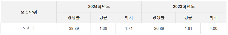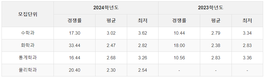 - 2023학년도에 비해 화학과의 경쟁률이 18.00:1에서 33.44:1로 크게 상승했습니다.
