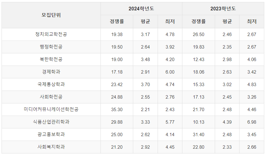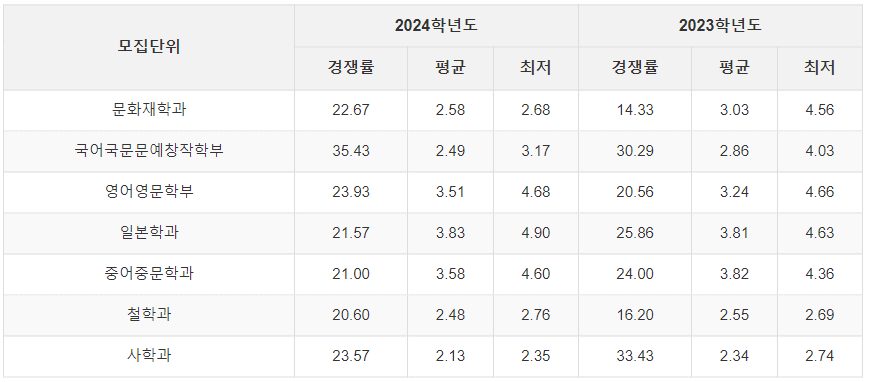 - 가장 높은 내신 평균을 보인 학과는 사학과(2.13), 경찰행정학부(2.18), 교육학과(2.19) 순입니다.