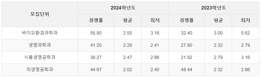 - 가장 높은 경쟁률을 보인 학과는 바이오환경과학과(55.8:1), 의생명공학과(44.67:1), 교육학과(42.33:1) 순입니다.