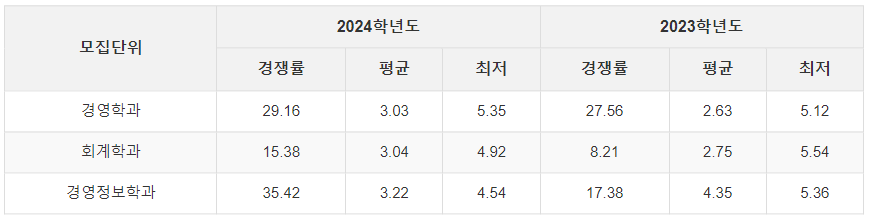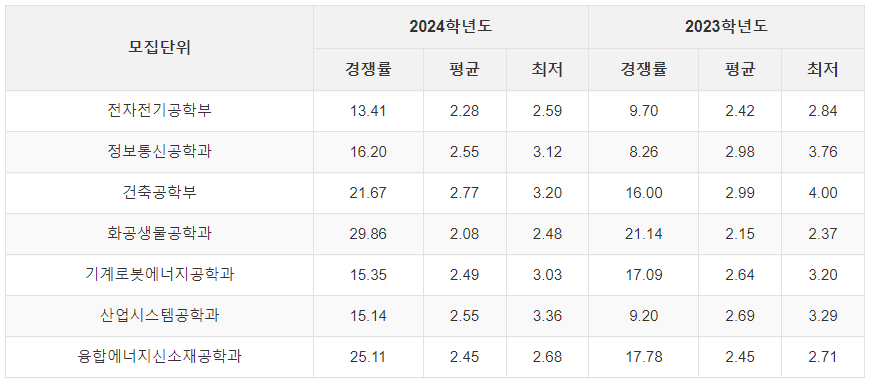 - 대부분의 학과에서 2023학년도보다 2024학년도의 내신 평균이 향상되었습니다.