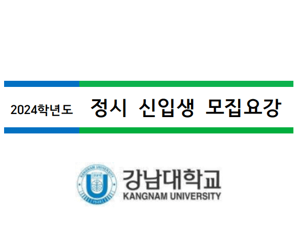 | 원서접수 | 2024.1.3.(수) ~ 1.6.(토) 오후 6시까지 * 인터넷접수 * 전체전형 * 강남대학교 입학 홈페이지( https://admission.kangnam.ac.kr ) * 인터넷 원서접수 대행기관 유웨이어플라이( https://www.uwayapply.com ) |