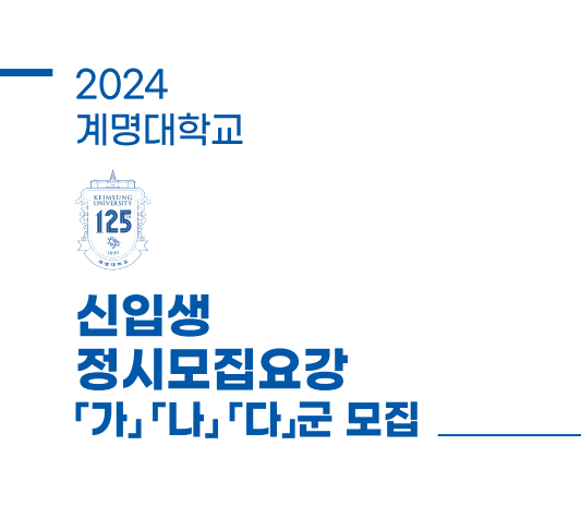 2024학년도 계명대 정시모집요강에 대해서 안내해 드리겠습니다. 주요 목차는 다음과 같습니다. 전형요약 및 주요 변경사항, 모집인원 총괄표, 원서접수 및 전형일정 안내, 세부 전형 안내[정원 내(가, 나, 다군 수능 일반전형, 가군 실기/실적 예체능전형, 다군 수능 지역기회균형전형). 정원 외(수능 농어촌전형, 수능 기회균형전형, 가, 다군 학생부교과 특성화고교전형, 가, 다군 학생부교과 특성화고졸재직자전형, 가, 다군 학생부교과 만학도전형)], 대학수학능력시험 반영방법, 지원자 유의사항, 전형료, 대학생활 안내 등의 내용이 수록되어 있습니다. 자세한 모집요강의 내용은 아래 내용을 클릭하시면 확인해 보실 수 있습니다.