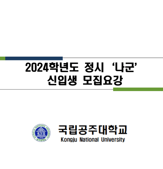 | 원서접수 | 2024.1.3.(수) 오전 9시 ~ 1.6.(토) 오후 6시까지 * 온라인 접수만 진행(방문, 우편접수 미실시) * 공주대학교 입학 홈페이지( https://ipsi.kongju.ac.kr ), 공주대 홈페이지( https://www.kongju.ac.kr ) * 인터넷 원서접수 대행기관 진학어플라이( https://www.jinhakapply.com ) * 원서접수 완료 후에는 변경 및 접수 취소가 불가함 |