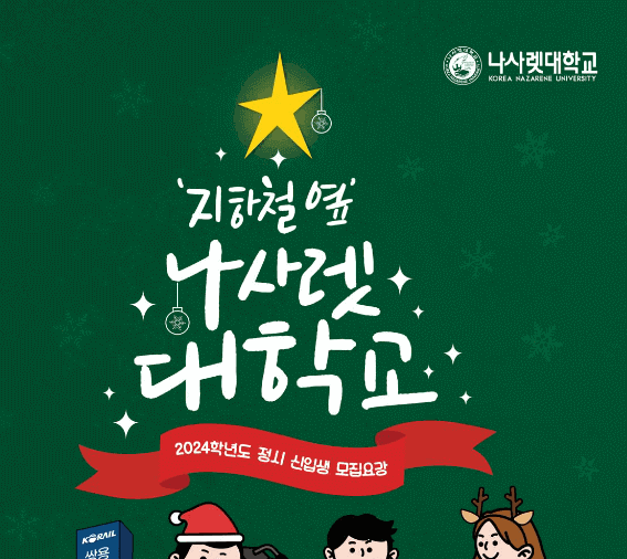 | 원서접수 | 2024.1.3.(수) ~ 1.6.(토) 까지 * 입학처 홈페이지 원서접수(방문 접수 불가) * 나사렛대학교 입학 홈페이지( https://ipsi.kornu.ac.kr ) * 인터넷 원서접수 대행기관 유웨이어플라이( https://www.uwayapply.com ) |