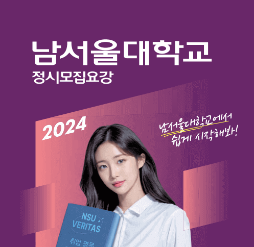 | 원서접수 | 2024.1.3.(수) ~ 1.6.(토) 까지 * 인터넷 원서접수 * 기간 중 24시간 계속(단, 접수 마감일은 18:00까지) * 남서울대학교 입학 홈페이지( http://www.namseoul.net ) * 인터넷 원서접수 대행기관 유웨이어플라이( https://www.uwayapply.com ) |