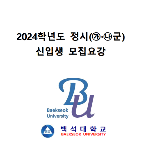 2024학년도 백석대 정시모집요강에 대해서 안내해 드리겠습니다. 주요 목차는 다음과 같습니다. 전형 주요 사항 안내, 전년 대비 전형 변경 주요 사항, 정시모집 인원 총괄표, 전형 유형별 반영비율 및 모집인원, 전형일정, 지원자격 및 지원방법, 대학별 고사(면접 및 실기) 일정, 대학수학능력시험 성적 반영방법, 전형별 세부사항(일반전형 수능위주, 일반전형 실기위주, 정원 외 특별전형 특성화고교 전형, 정원 외 특별전형 농어촌학생 전형, 정원 외 특별전형 기초생활수급자 및 차상위계층 전형, 정원 외 특별전형 특성화고졸재직자 전형), 지원자 공통사항, 복수지원 및 이중등록 금지, 사정원칙 및 동점자 처리기준, 전형료 및 합격자 등록·포기, 학사제도, 장학제도 등의 내용이 수록되어 있습니다. 자세한 모집요강의 내용은 아래 내용을 클릭하시면 확인해 보실 수 있습니다.
