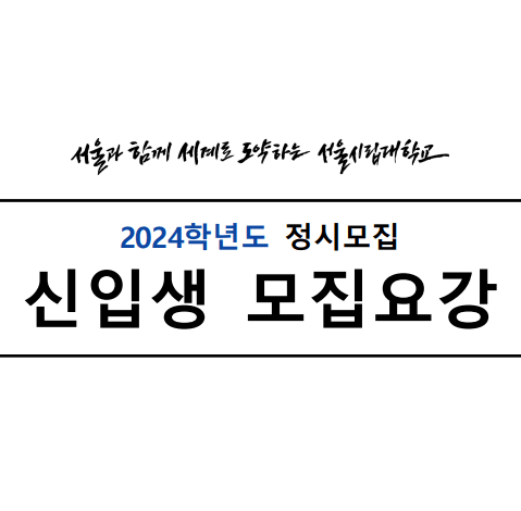 2024학년도 서울시립대 정시모집요강에 대해서 안내해 드리겠습니다. 주요 목차는 다음과 같습니다. 모집단위별 입학정원 및 전형유형별 모집인원, 대학수학능력시험 반영방법, 입학전형 일정, 대학지원 및 등록 관련 유의사항, 대학입학 전형자료 온라인 제공에 관한 사항, 전형료, 원서 작성요령 및 접수절차, 합격자발표 및 등록안내, 기타 유의사항, 이의신청 방법 및 절차 안내, 정시모집 <가>군, 정시모집 <나>군, 기회균형전형 2(정원 외 특별전형), 학교생활기록부 제출 방법(정시모집 모든 전형 공통), 학교생활기록부 반영 방법(예체능계열만 해당), 각종 서식 등의 내용이 수록되어 있습니다. 자세한 모집요강의 내용은 아래 내용을 클릭하시면 확인해 보실 수 있습니다.
