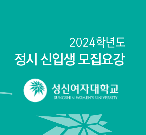 | 원서접수 | 2024, 1.3.(수) 오전 11:00 ~ 1.6.(토) 오후 6:00 까지 * 인터넷 접수 - 성신여대 입학 홈페이지( https://ipsi.sungshin.ac.kr ) - (주) 유웨이어플라이( https://www.uwayapply.com ) |