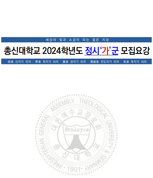 2024학년도 총신대 정시모집요강에 대해서 안내해 드리겠습니다. 주요 목차는 다음과 같습니다. 2024학년도 정시모집 입학전형 주요 사항, 2024학년도 학과별 정원 내 입학정원, 2024학년도 정시모집 '가'군 전형별 모집인원, 2024학년도 정시모집 '가'군 전형일정 및 원서접수 절차, 전형별 세부 안내(전형별 모집인원 및 지원자격, 전형별 전형요소 및 반영비율, 대학수학능력시험 반영방법, 구술면접고사, 교회음악과 실기고사, 동점자처리기준), 제출서류 안내, 지원자 유의사항, 등록포기 및 환불안내, 전형료, 학사안내, 문의처 등의 내용이 수록되어 있습니다. 자세한 모집요강의 내용은 아래 내용을 클릭하시면 확인해 보실 수 있습니다.