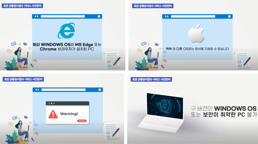 원서를 작성하기 위해서는 최신 WINDOWS OS와 MS Edge 또는 Chrome 브라우저가 설치된 PC가 있어야 합니다. 맥북 등 다른 OS로는 원서를 지원할 수 없고, 반드시 WINDOWS OS의 PC를 사용해야 합니다. 대부분의 학생들이 WINDOWS 10이 설치된 PC를 이용해 안전하게 원서를 접수하지만 간혹 구버전의 WINDOWS OS나 보안에 취약한 PC를 사용하면 원서접수가 안 되는 경우가 있습니다. 원서접수 전 원서를 작성할 PC를 체크해 보는 것, 잊지 마시기 바랍니다.