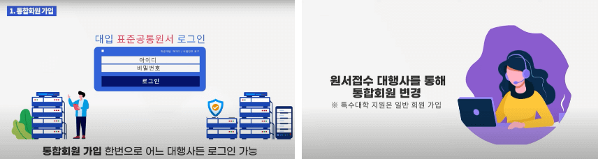 가장 먼저 해야 할 일은 통합회원 가입을 하셔야 합니다. 원서접수 대행사 중 한 곳을 선택해서 통합회원 가입을 합니다. 대행사간 연계를 통해 회원정보가 공유되기 때문에 통합회원 가입 한 번으로 어느 대행사든 로그인이 가능합니다. 실수로 통합회원 가입을 못했다면 원서접수 대행사 콜센터로 문의해 통합회원으로 변경하면 됩니다. 단, 경찰대학, 사관학교, 카이스트 등 공통원서를 이용하지 않는 특수대학은 일반 회원으로 가입을 해야 합니다.