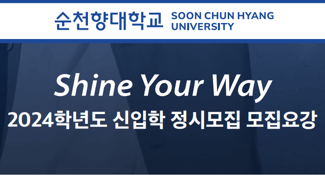 | 원서접수 | 2024.1.3.(수) 오전 10시 ~ 1.6.(토) 오후 7시까지 * 인터넷 원서접수(별도의 원서 교부 및 방문 접수 없음) * 순천향대학교 홈페이지( https://ipsi.sch.ac.kr ) * 인터넷 원서접수 대행기관 유웨이어플라이( https://www.uwayapply.com ) |