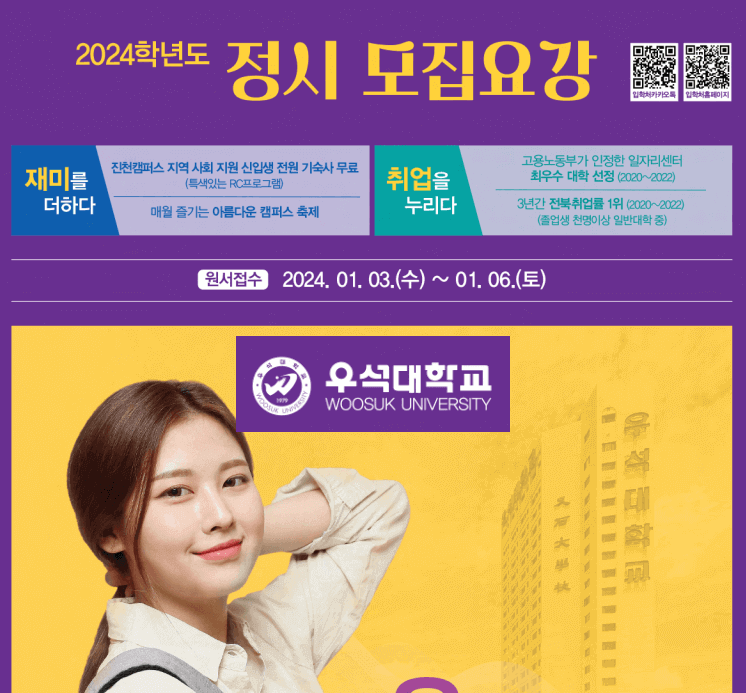 | 원서접수 | 2024.1.3.(수) 오전 9시 ~ 1.6.(토) 오후 6시까지 * 인터넷 접수(접수처 추후공지) - 진학어플라이( https://www.jinhakapply.com ) - 유웨이어플라이( https://www.uwayapply.com ) [방문접수] - 전주캠퍼스: 대학본부 1층 입학원서 접수처 - 진천캠퍼스: 미래센터 1층 입학원서 접수처 * 우석대학교 입학 홈페이지( https://enter.woosuk.ac.kr ) |