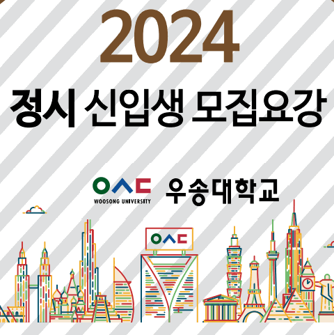 | 원서접수 | 2024.1.3.(수) ~ 1.6.(토) 오후 7시까지 * 우송대학교 홈페이지( https://www.wsu.ac.kr ) * 우송대학교 입학 홈페이지( http://ent.wsu.ac.kr ) * 인터넷 원서접수 대행기관 유웨이어플라이( https://www.uwayapply.com ) |