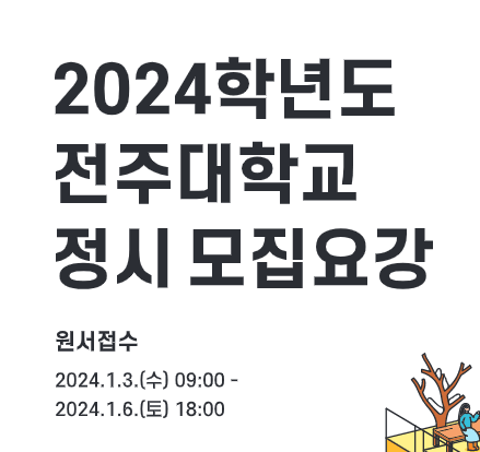| 원서접수 | 2024.1.3.(수) 오전 9시 ~ 1.6.(토) 오후 6시까지 * 인터넷 원서접수 * 접수기간 중 24시간 접수 가능 * 전주대학교 입학 홈페이지( https://iphak.jj.ac.kr ) * 인터넷 원서접수 대행기관 유웨이어플라이( https://www.uwayapply.com ) |
