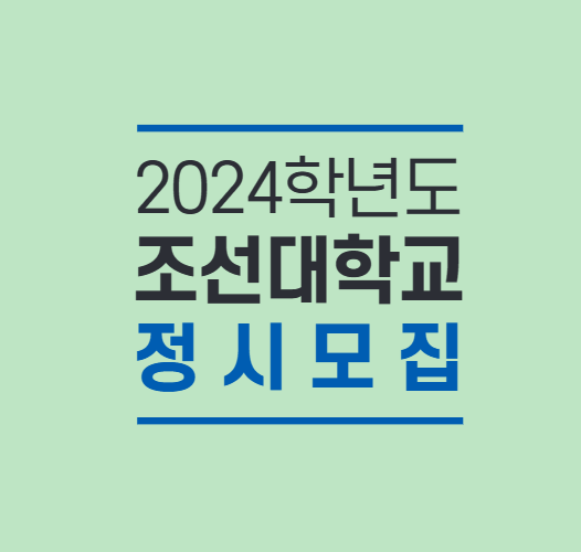 | 원서접수 | 2024.1.3.(수) 오전 9시 ~ 1.6.(토) 오후 6시까지 * 입학처 홈페이지 원서접수(방문 접수 불가) * 조선대학교 입학 홈페이지( http://i.chosun.ac.kr ) * 인터넷 원서접수 대행기관 진학어플라이( https://www.jinhakapply.com ) |