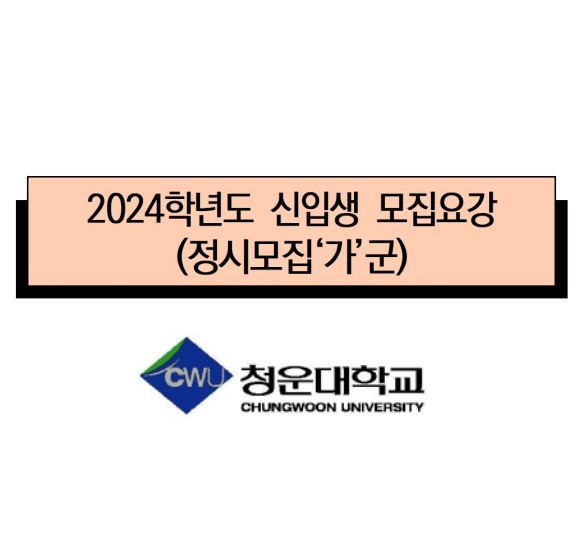 | 원서접수 | [인터넷 접수] * 2024.1.3.(수) ~ 1.6.(토) 오후 7시까지 * 유웨이어플라이( https://www.uwayapply.com ) 마감일 19:00까지 [방문접수] * 2024.1.3.(수) ~ 1.6.(토) 오후 6시까지 * 입학처(대학본부 121호) 마감일 18:00까지 * 청운대학교 입학 홈페이지( http://enter.chungwoon.ac.kr ) * 인터넷 원서접수 대행기관 유웨이어플라이( https://www.uwayapply.com ) |