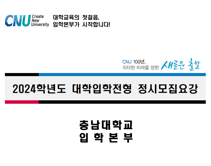 | 원서접수 | 2024.1.3.(수) 오전 9시 ~ 1.6.(토) 오후 6시까지(공휴일 포함) * 인터넷 원서접수 * 충남대학교 홈페이지( http://ipsi.cnu.ac.kr ) * 인터넷 원서접수 대행기관 진학어플라이( https://www.jinhakapply.com ) |