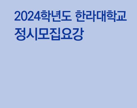 2024학년도 한라대 정시모집요강에 대해서 안내해 드리겠습니다. 주요 목차는 다음과 같습니다. 전형요약 및 주요사항(변경사항), 모집단위(학과)별 입학정원, 전형별 모집인원, 원서접수 및 전형일정, 합격자 발표 및 등록, 전형별 안내[수능위주 일반학생(수능중심), 학생부교과 일반학생(교과중심), 학생부교과 성인학습자, 학생부교과 농어촌학생(정원 외), 학생부교과 특성화고교 졸업자(정원 외), 학생부교과 기회균형(정원 외), 학생부교과 특수교육대상자(정원 외), 학생부교과 특성화고 등을 졸업한 재직자(정원 외), 학생부교과 만학도(정원 외), 기타 외국인], 대학수학능력시험 성적 반영방법, 학교생활기록부 반영방법, 면접안내, 지원자 유의사항, 등록포기 및 환불 안내, 전형료, 정시장학금, 통학버스 및 학생생활관 등의 내용이 수록되어 있습니다. 자세한 모집요강의 내용은 아래 내용을 클릭하시면 확인해 보실 수 있습니다.