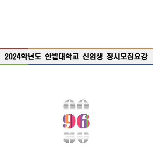 2024학년도 한밭대 정시모집요강에 대해서 안내해 드리겠습니다. 주요 목차는 다음과 같습니다. 전형요약, 전형일정, 전형별 모집인원, 입학원서 접수(인터넷 접수), 전형료, 세부 전형별 안내[수능위주_가군/나군 일반전형, 가군/나군 일반전형(학·석사), 가군/나군 농어촌학생전형, 가군/나군 특성화고교졸업자전형, 가군/나군 사회적배려자전형, 가군/나군 특수교육대상자전형, 학생부종합_나군 평생학습자전형(미래/사회), 나군 산업체경력전형(야간), 나군 특성화고등을졸업한재직자전형], 동점자 처리기준(우선선발 순위), 대학수학능력시험 반영방법, 지원자 유의사항, 합격자 발표 및 등록, 학생부종합전형 평가기준, 제출서류 양식, 학사안내 등의 내용이 수록되어 있습니다. 자세한 모집요강의 내용은 아래 내용을 클릭하시면 확인해 보실 수 있습니다.