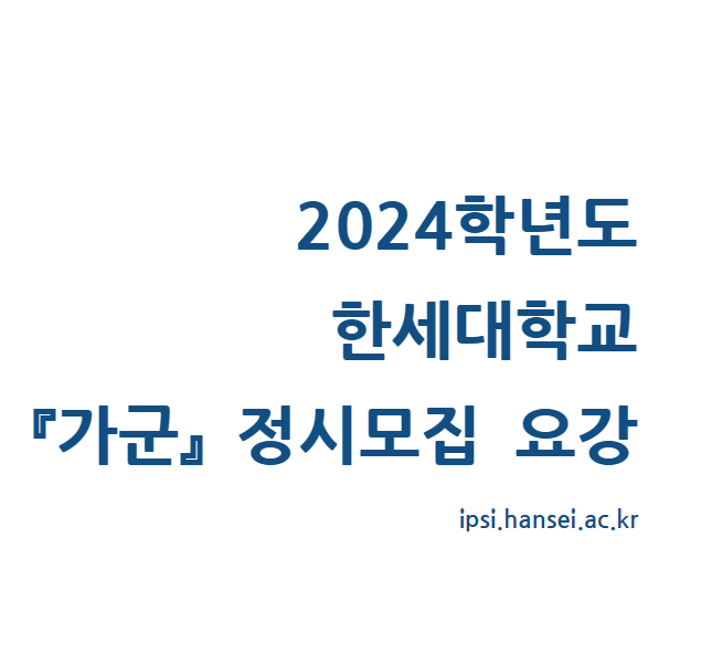 2024학년도 한세대 정시모집요강에 대해서 안내해 드리겠습니다. 주요 목차는 다음과 같습니다. 정시 「가」군 모집단위(학과) 및 모집인원, 전형유형별 전형방법, 정시 「가」군 전형일정, 인터넷 원서접수 및 전형료, 제출서류 및 고사 유의사항, 개인정보 수집 관련사항, 선발기준, 합격자 발표 및 등록, 일반전형[수능], 일반 전형(예술)[실기/실적], 특성화고교 졸업자 전형(정원 외)[수능, 실기/실적], 농·어촌학생 전형(정원 외)[수능, 실기/실적], 특수교육대상자 전형(정원 외)[수능, 실기/실적], 대학수학능력시험 반영방법, 실기고사, 신입생 장학금 안내, 간호교육인증제 안내, 제출서류 서식 등의 내용이 수록되어 있습니다. 자세한 모집요강의 내용은 아래 내용을 클릭하시면 확인해 보실 수 있습니다.