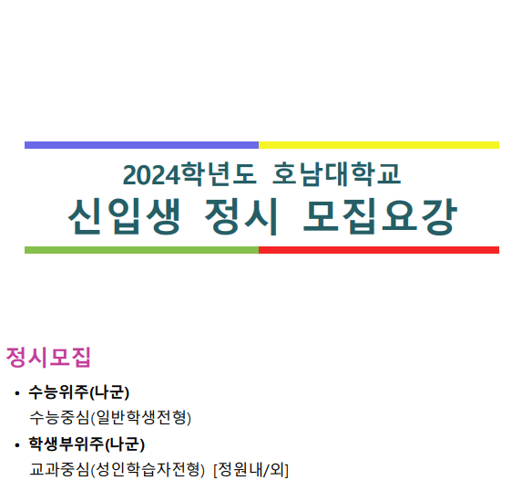 2024학년도 대학수학능력시험일이 얼마 남지 않았습니다. 지난 1년여간 수험생활을 하면서 정신적, 육체적으로 많은 스트레스가 쌓였으리라 생각됩니다. 고 3 및 N수생 여러분들께서 조금만 더 집중하고 노력하셔서 좋은 성적을 거두셨으면 좋겠습니다. 오늘은 호남대학교 정시모집에 대한 정보를 가지고 왔습니다. 정시모집 실시간 경쟁률 확인, 정시모집 충원합격자발표, 정시모집 합격자발표, 입시결과, 원서접수일 및 서류제출, 모집요강, 경쟁률, 입학상담 Q&A, 공통원서 접수방법 등에 대해서 알아보도록 하겠습니다. 수험생 및 학부모님들께서 참고하시면 많은 도움이 되시리라 생각됩니다.
