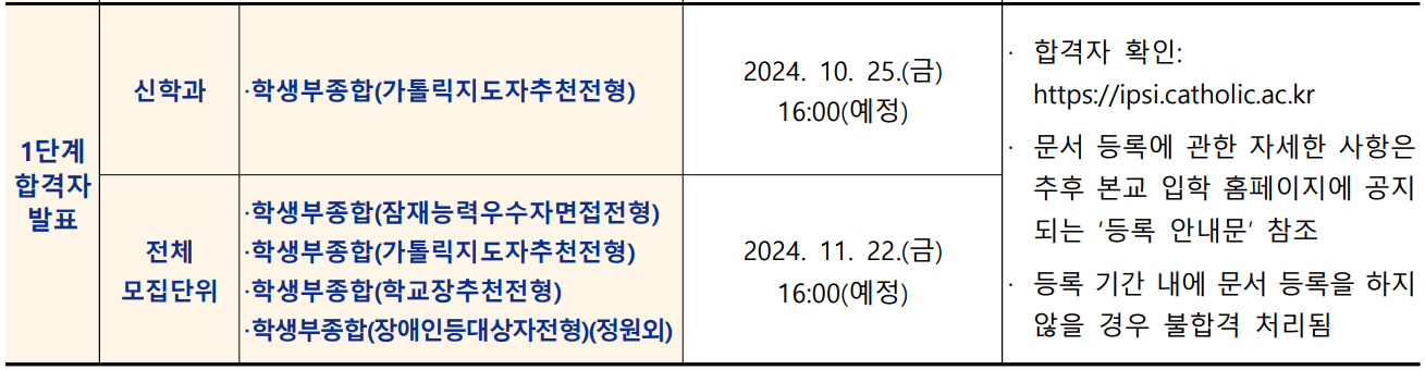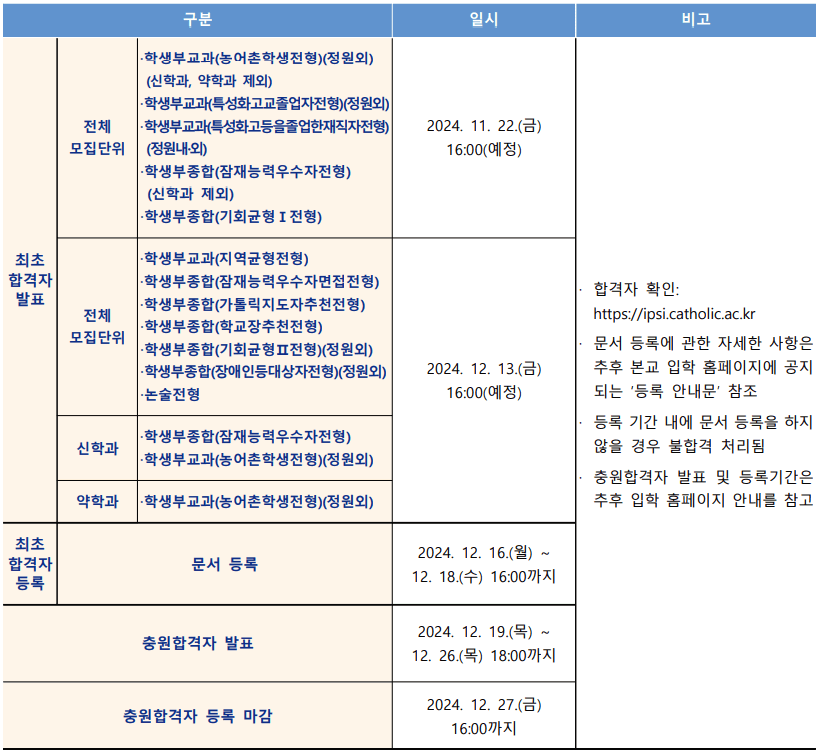 | 원서접수 | 2024.9.9.(월) 10:00 - 9.13.(금) 17:00 | *접수처: https://ipsi.catholic.ac.kr |