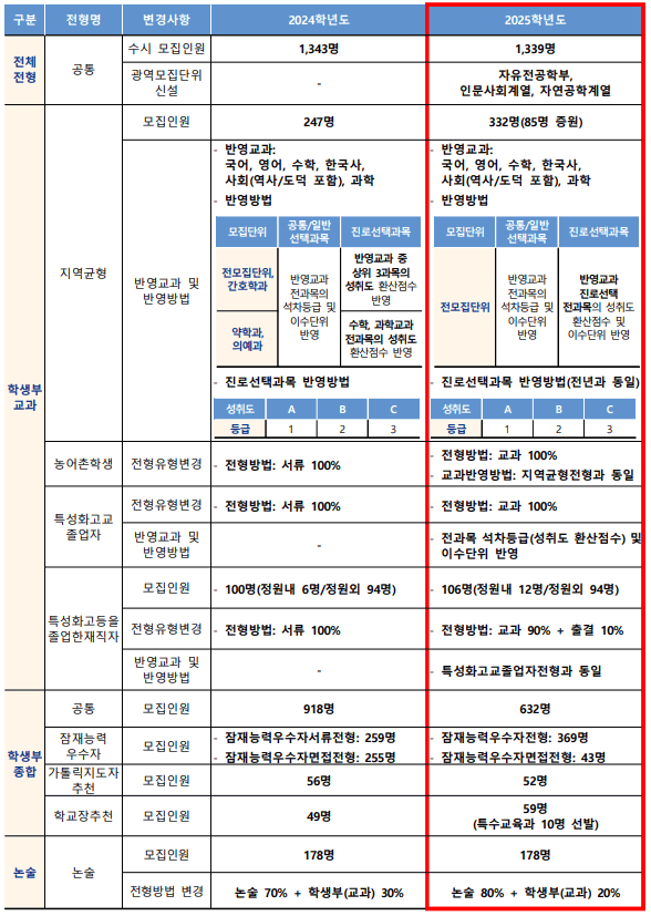 | 구분 | 인문사회, 자연공학, 약학과, 음악과, 특수교육과, 자유전공학부, 글로벌경영대학 |