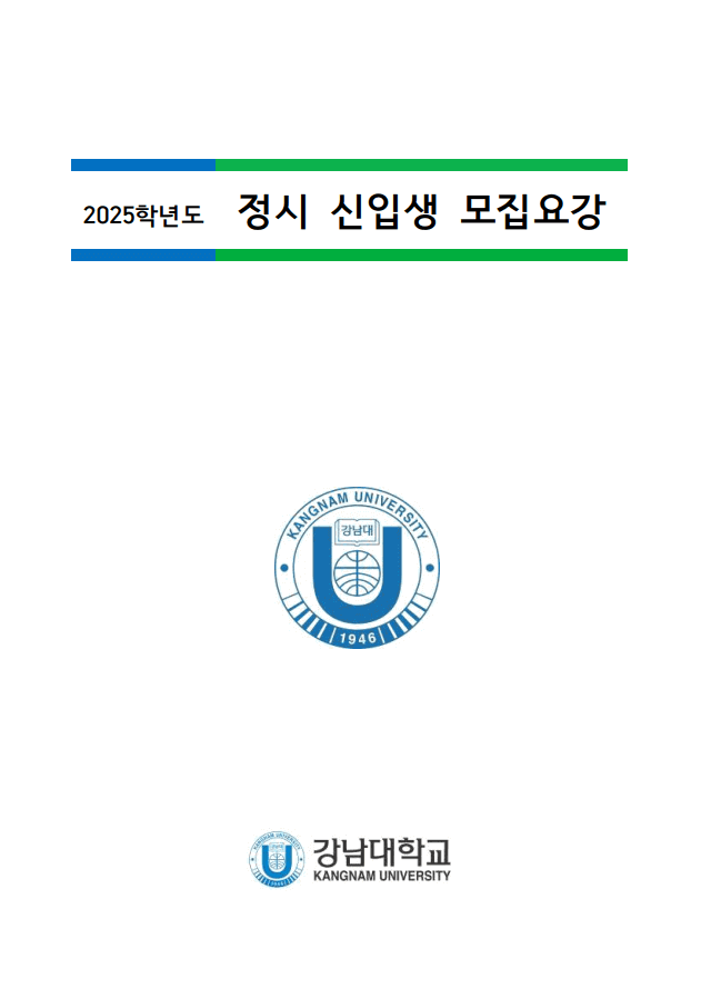 2025학년도 강남대 정시모집요강에 대해서 안내해 드리겠습니다. 주요 내용으로는 전형요약 및 주요사항[전형요약 및 주요 변경사항, 2025학년도 모집단위(학과) 및 입학정원(정원내), 2025학년도 정시 전형별 모집인원, 2025학년도 전형일정 및 유의사항], 2025학년도 전형안내(p.12~23참조)[수능/실기(일반학생전형), 수능(기초생활수급자·차상위계층·한부모가족 지원대상자전형), 수능(특성화고교졸업자전형), 수능(장애인 등 대상자전형), 학생부종합(군위탁전형)], 참고사항[수능성적 반영방법 안내, 실기고사 안내, 지원자 유의사항, 등록포기 및 환불 안내, 전형료], 대학생활 안내[학사제도 안내, 장학제도 안내, 장애학생 지원 안내, 기숙사 안내, 학군사관 후보생(ROTC) 안내, 교통편 안내, 캠퍼스맵] 등의 내용이 수록되어 있습니다.