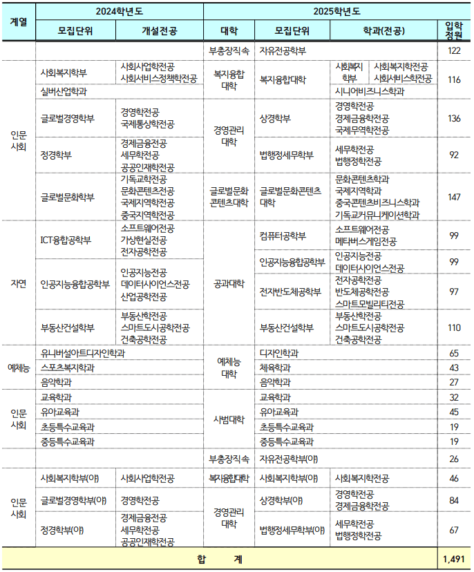 ● 학사구조 개편에 따른 모집단위(학과) 변경 및 입학정원