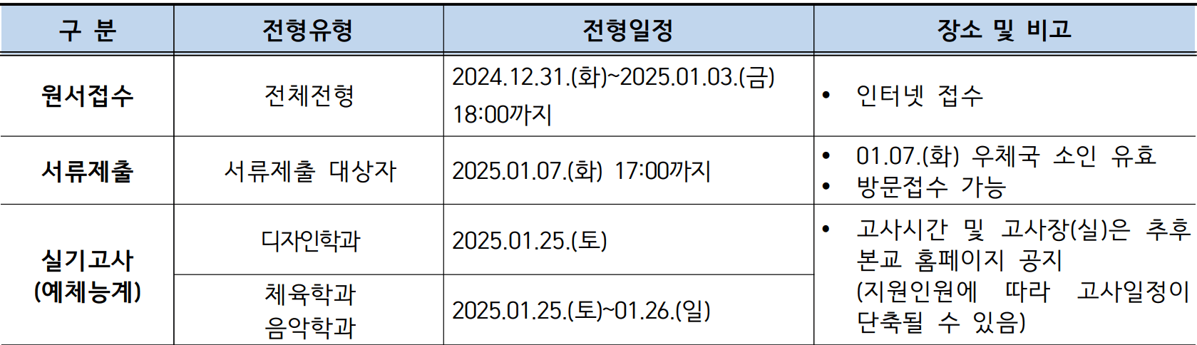 | 구분 | 전형유형 | 전형일정 | 장소 및 비고 |