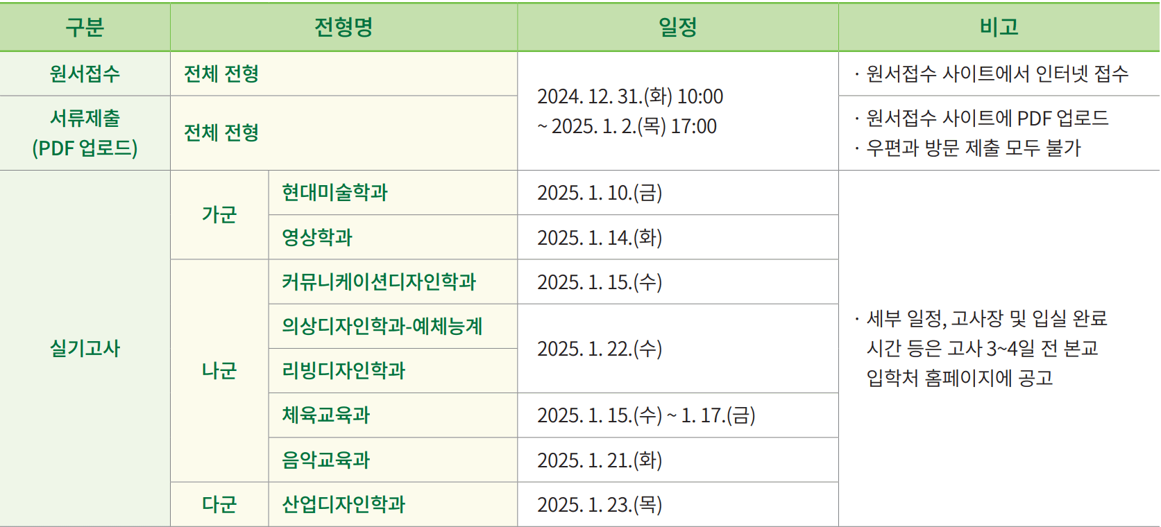 | 5 | 서류제출 (PDF 업로드) | * 제출기한: 2024. 12. 31.(화) 10:00 ~ 2025. 1. 2.(목) 17:00 * 제출방법: 온라인 원서접수 사이트에 PDF 파일 업로드 ※ 우편 및 방문 제출 불가 ※ 이미지(jpg, jpeg, png, bmp, gif) 파일은 불가하며, 반드시 PDF 파일로 업로드하여야 함 ※ 최종 등록한 자는 원서접수 시 제출한 PDF 서류의 원본을 본교에 우편으로 제출해야 하며, 원서접수 시 제출한 서류와 원본이 다를 경우 입학이 취소될 수 있음 * 업로드한 파일이 오류로 인해 열리지 않거나, 내용이 육안으로 식별이 불가능할 경우 재업로드(제출)를 요구할 수 있으며, 안내되는 기한 내에 업로드(제출)하여야 함 |