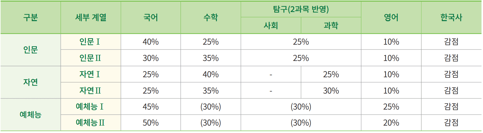 | 자연/예체능 | 200 | 198 | 196 | 193 | 188 | 183 | 180 | 170 | 160 |