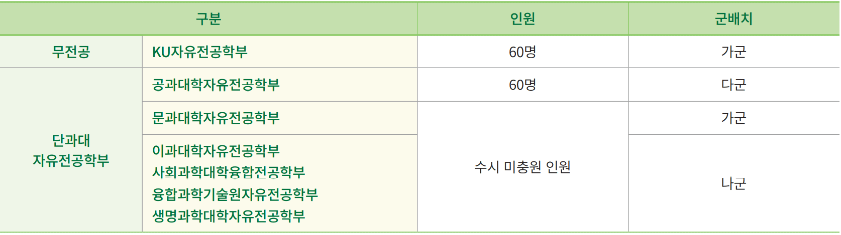 | 나군 | KU일반학생전형 | 689 | 4,300 | 6.24 : 1 |