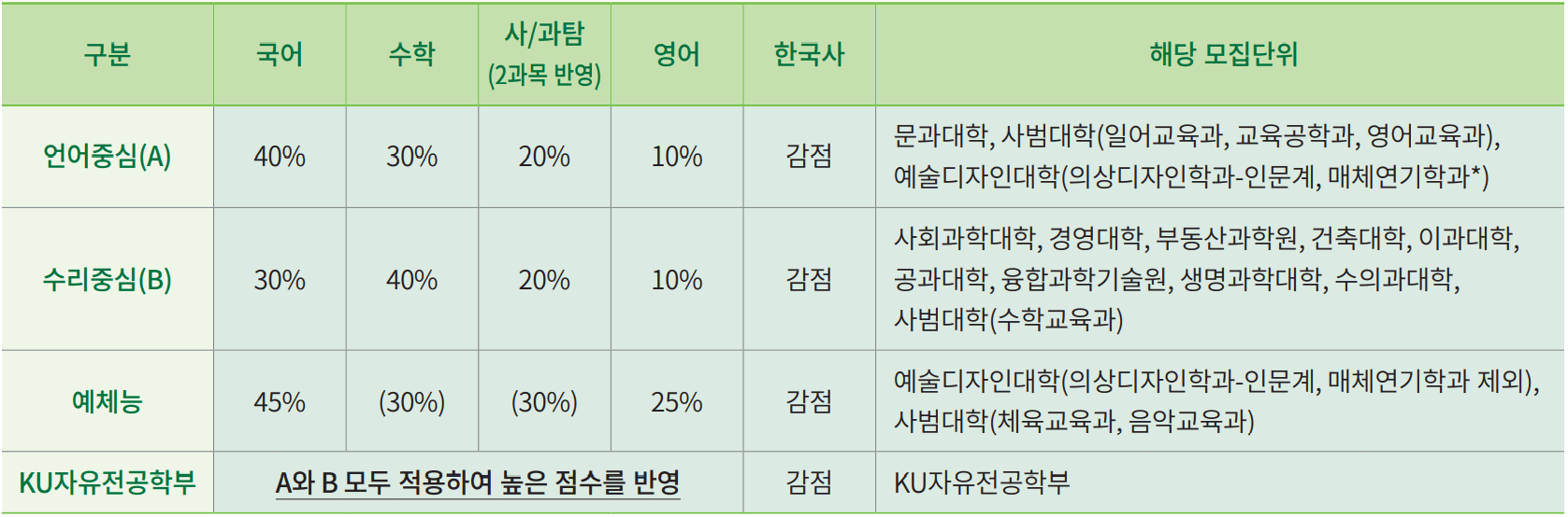 ※ [예체능] 수학과 사/과탐 영역 중 반영점수가 높은 영역 반영(수학이나 탐구 영역 중 한 영역 미응시도 가능) ※ 제2외국어·한문을 사/과탐 영역 과목으로 불인정