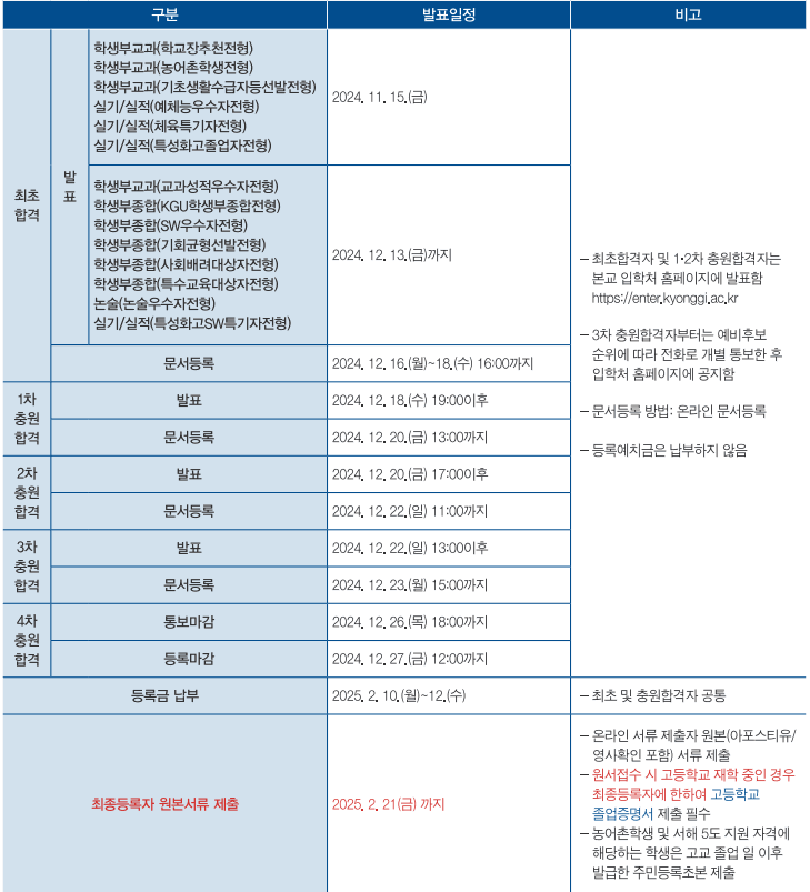 2025학년도 경기대 수시모집 합격자 발표일 및 충원(추가) 합격자 발표일 등을 안내해 드리도록 하겠습니다. 아래 일정을 참고하셔서 입학 등록에 차질이 없으시기 바랍니다.