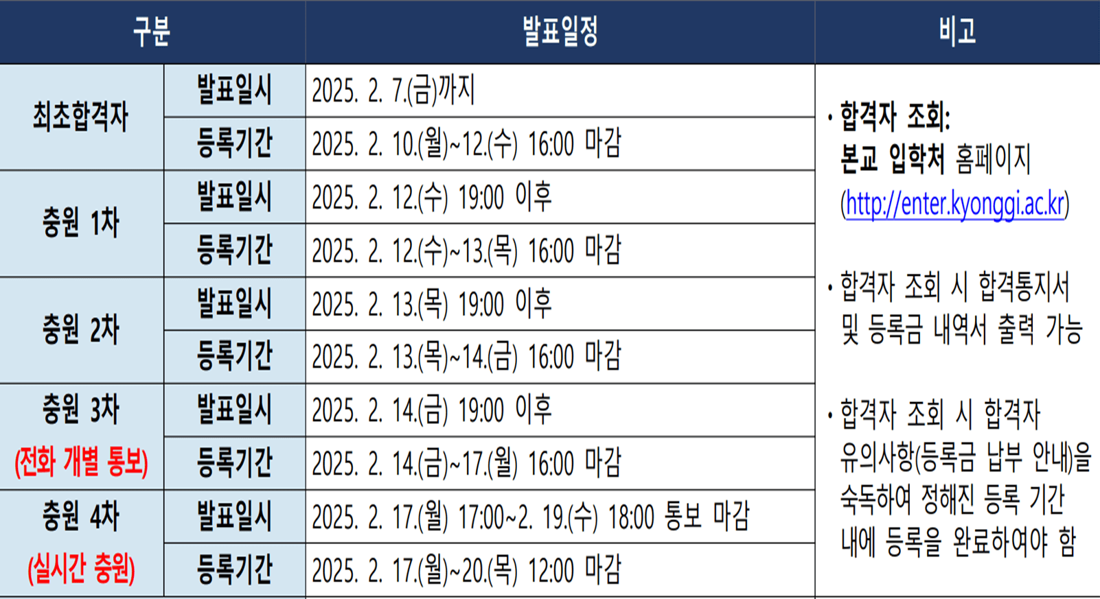 - 충원 3차 (전화 개별 통보) : 2025. 2. 14.(금) 19:00 이후