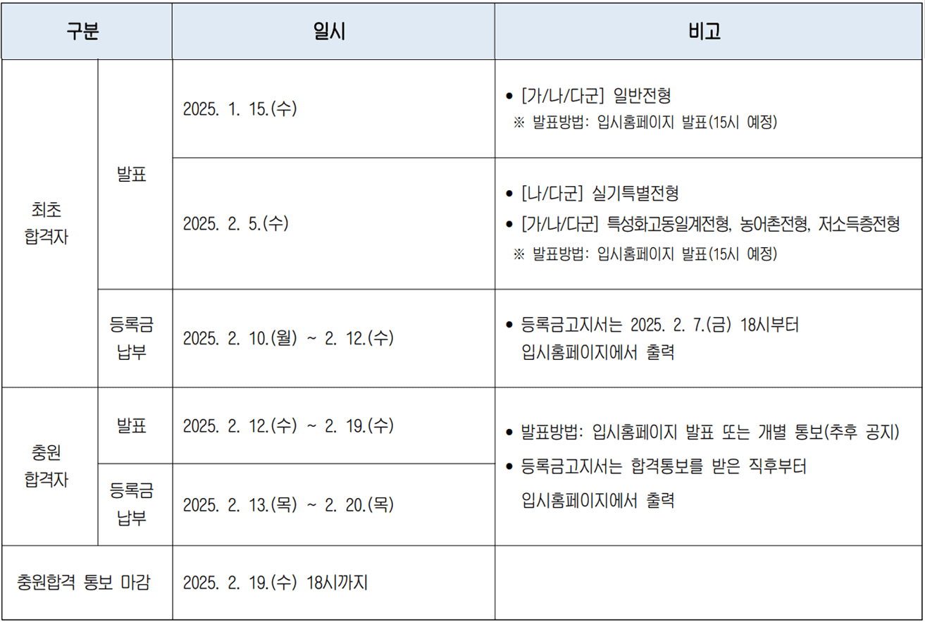 - 2025. 2. 5.(수) 15시 예정 : [나/다군] 실기특별전형, [가/나/다군] 특성화고동일계전형, 농어촌전형,