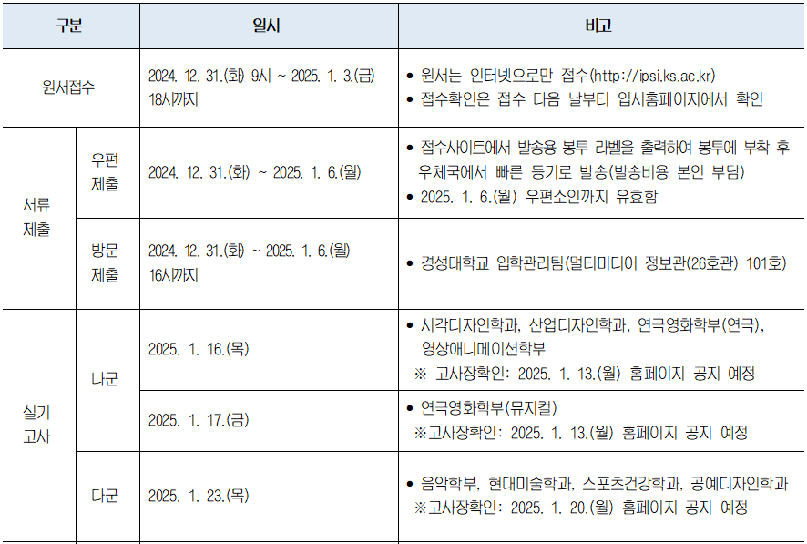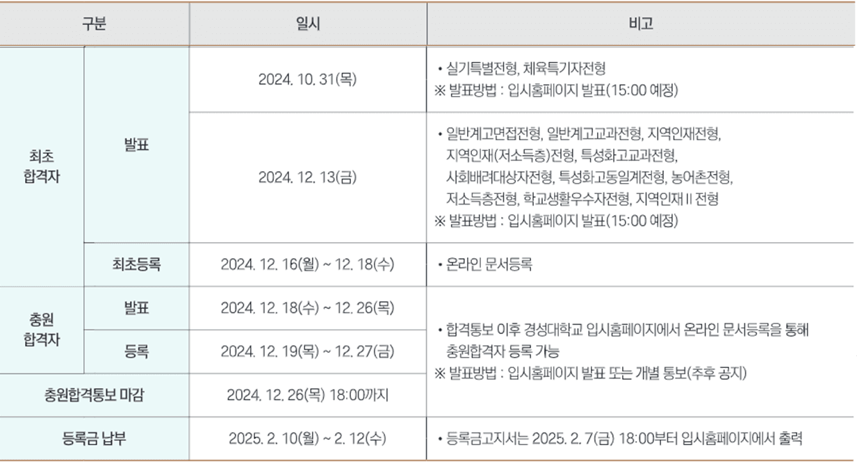 2025학년도 경성대 수시모집 합격자 발표일 및 충원(추가) 합격자 발표일 등을 안내해 드리도록 하겠습니다. 아래 일정을 참고하셔서 입학 등록에 차질이 없으시기 바랍니다.