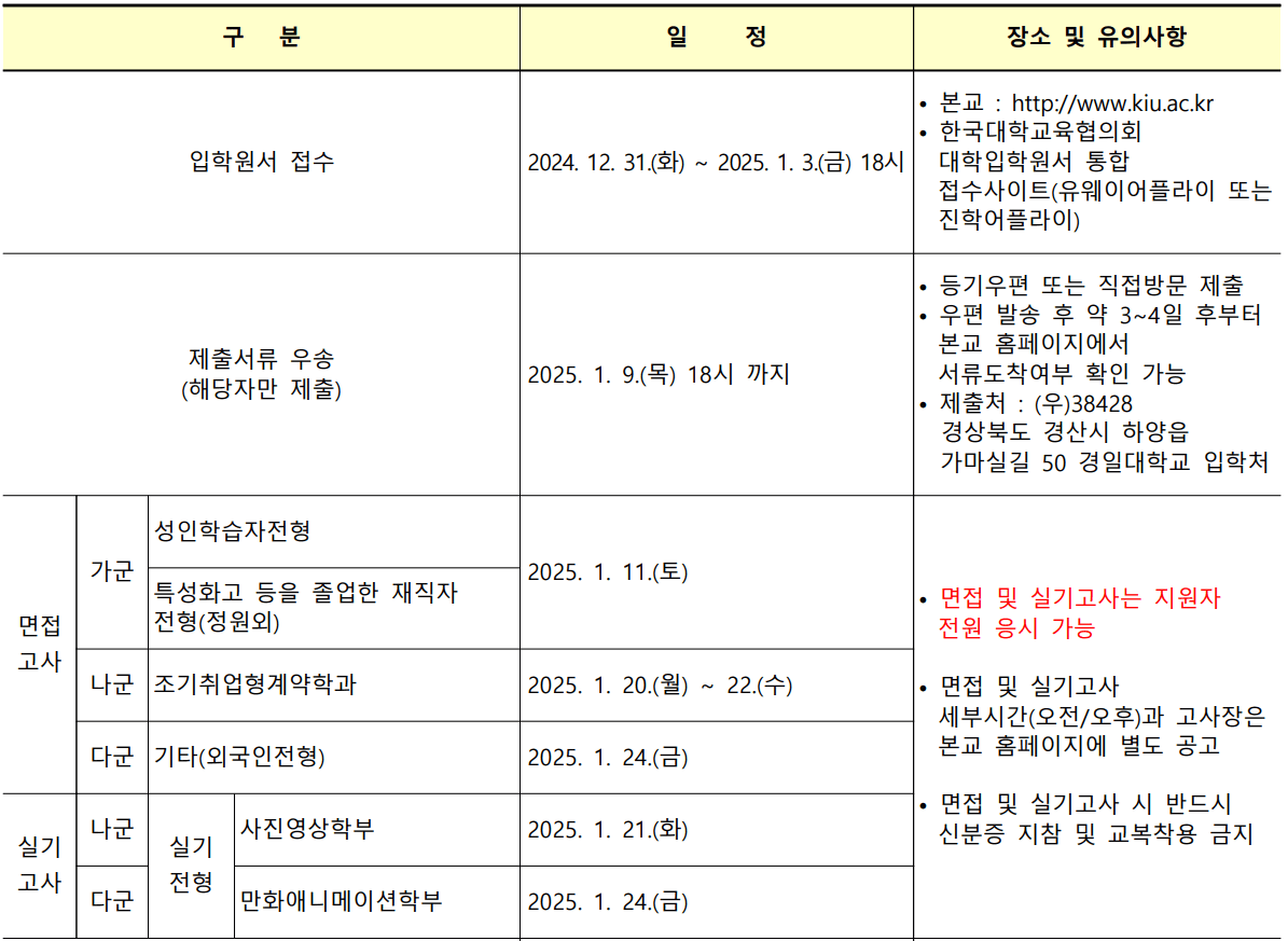 | 7 | ▶ 제출서류 우송 | * 제출 서류는 해당자에 한하여 경일대 입학처로 등기우편 또는 직접방문 제출 * 우편 제출 시 원서접수 완료 후 출력되는 "우편 발송용 표지"를 부착하여 발송 * 제출기한 : 2025.1.9.(목) 18:00까지 * 제출처 : (38428) 경북 경산시 하양읍 가마실길 50 경일대학교 입학처 |