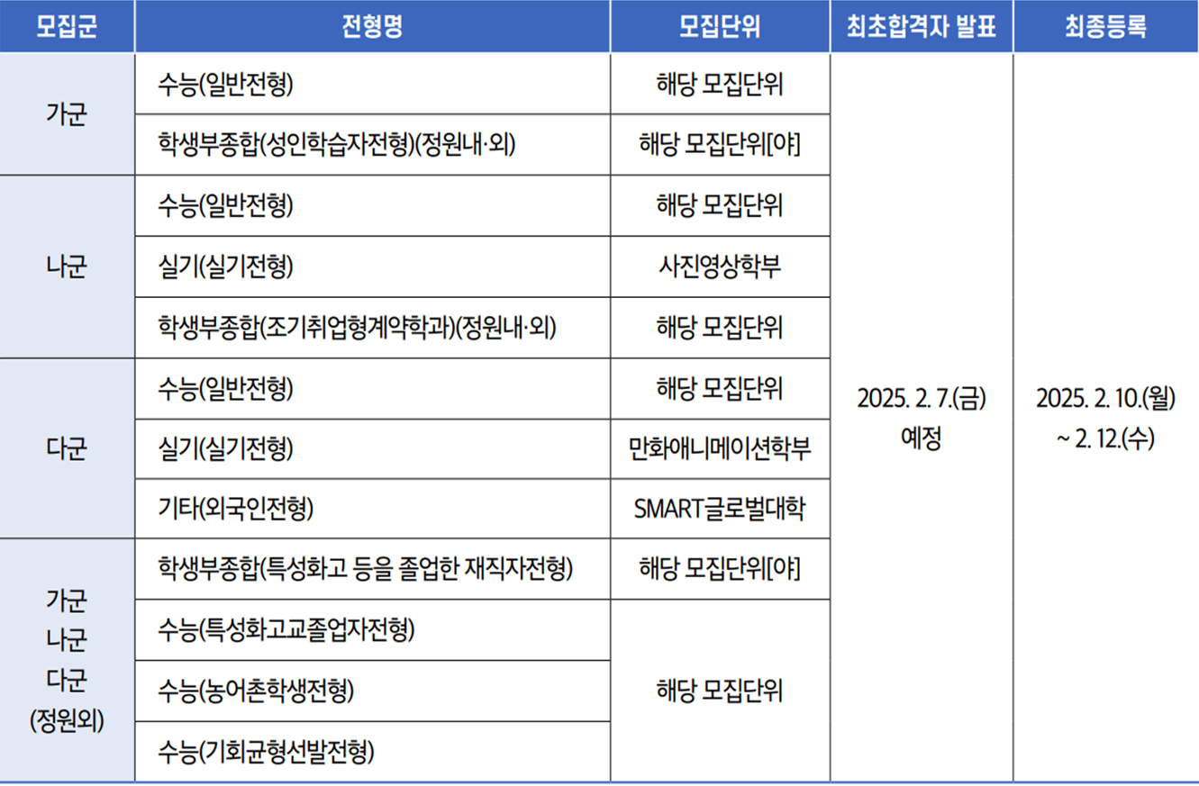 2025학년도 순천향대 수시모집 합격자 발표 및 충원(추가) 합격자 발표 정시모집 원서접수일 및